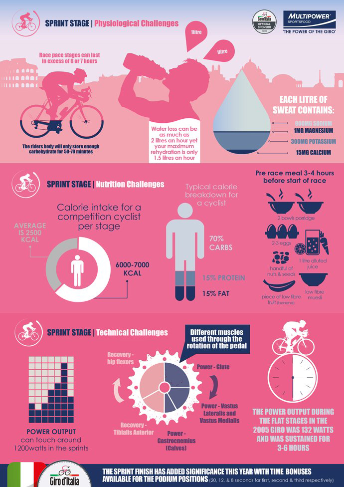 How would you like to eat 6,000-7,000 calories a day, and still be as skinny as rails? No problem. Simply make the peloton at the Giro D’Italia! Here’s a pretty cool infographic from sports nutrition company Multipower.