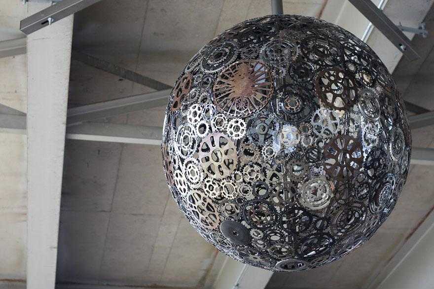 A couple of industrial artists/sculptors have have displayed public art under a highway overpass in San Antonio, Texas. Joseph O’Connell & Blessing Hancock created six 4′ “chandeliers” made primarily from old bicycle parts over a steel structure, and then integrated LED lighting to envelope the underpass in a remarkably elegant ambiance come dusk.
