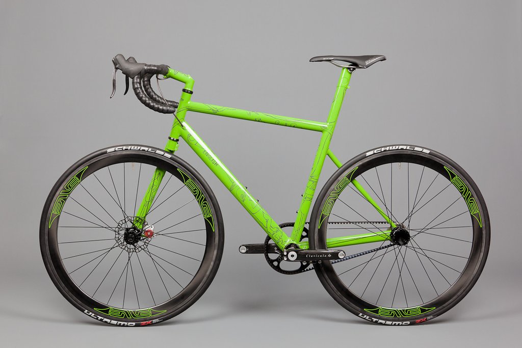 English Cycles is at it again. While Cannondale developed the Lefty fork, Quintana Roo took out the left seat stay on their Illicito TT bike, and Culprit Bikes completely took out both seat stays on their new Legend, here’s Rob English’s interpretation of his latest singlespeed, front disc brake. and belt drive road bike. (And if you’re looking for the rear brakes, it’s below the bottom bracket, a la Trek’s new Madone, and Museeuw bikes.) Pretty darn cool.